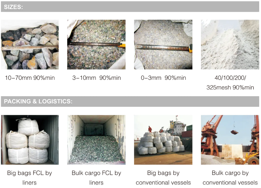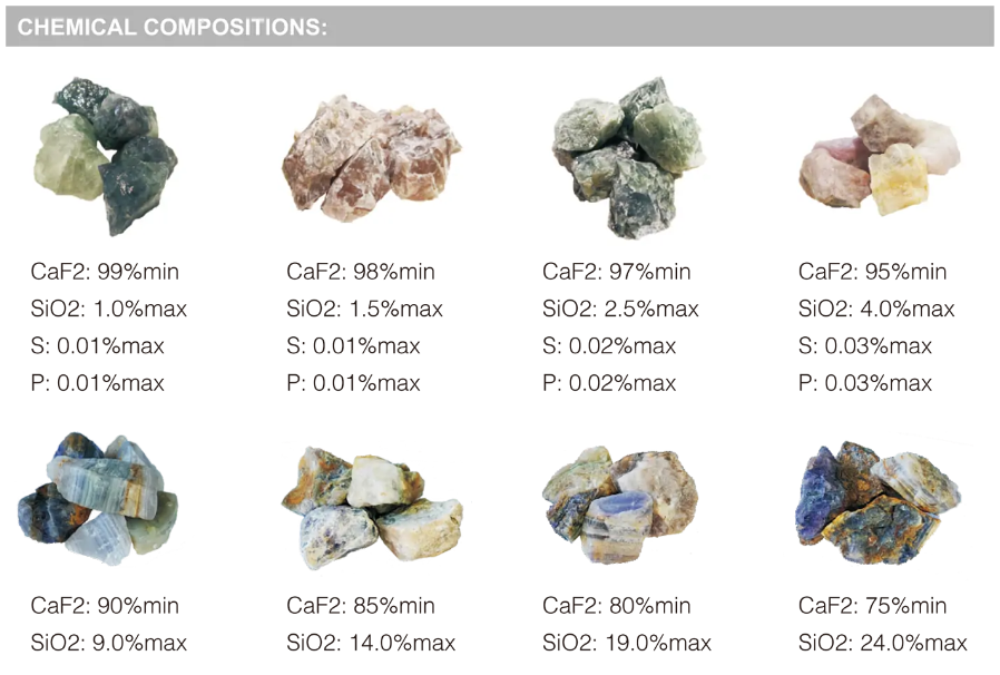 Metallurgy FluorsparCAF2: 85-99%SIO2:1-14%SIZE: 10-50MM, 3-10MM, 3-30MM 90%MIN 100MESH, 200MESH